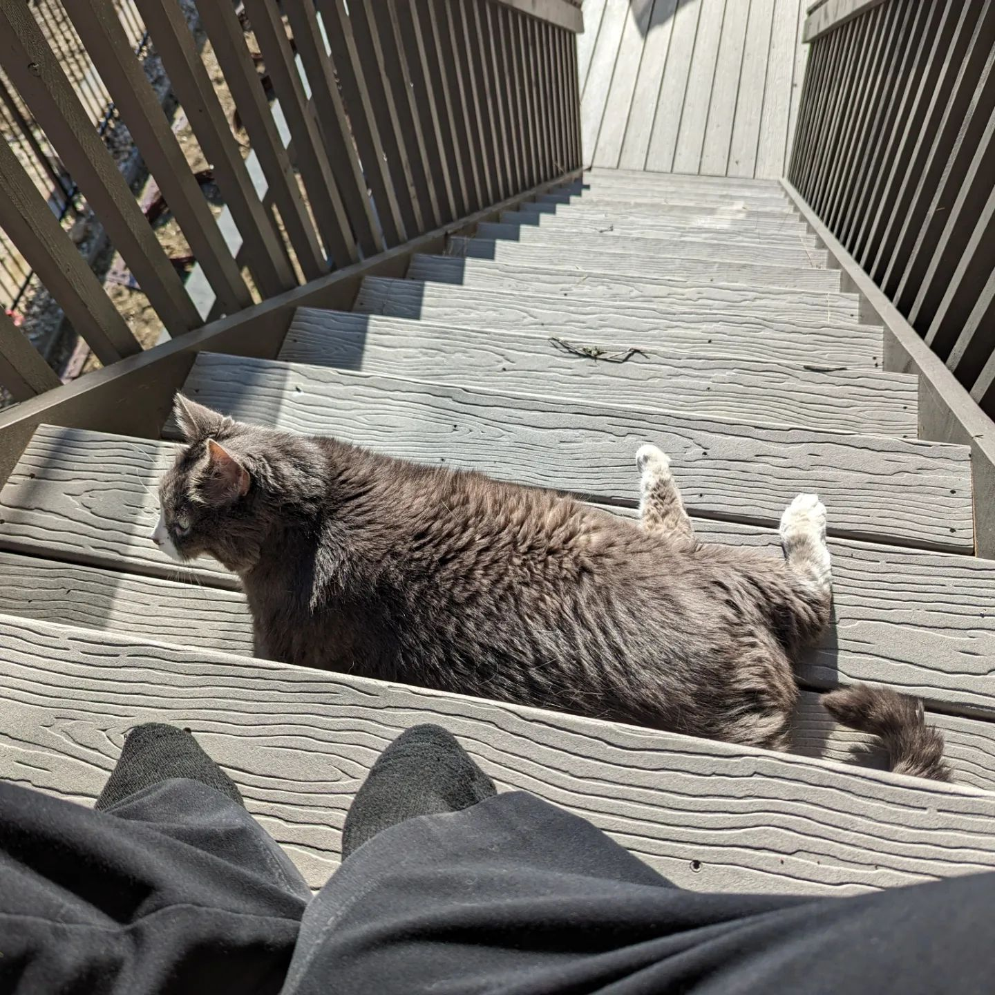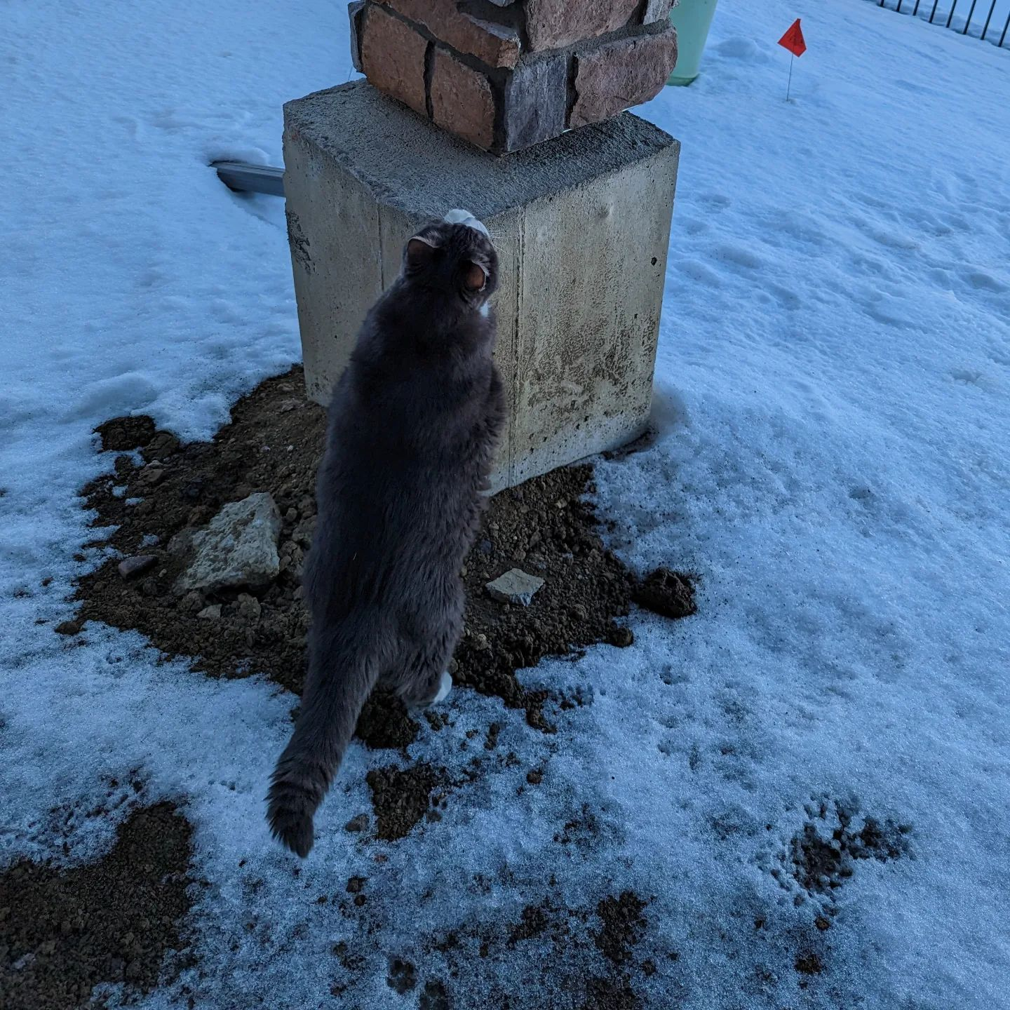 Outdoor adventure, part 2.... Checking on the infinity stair project. Our walkout basement door and our main floor patio door are connected by stairs. Ziggy is determined to go out one door and in through the other ... Well, not if the stairs are snowy.