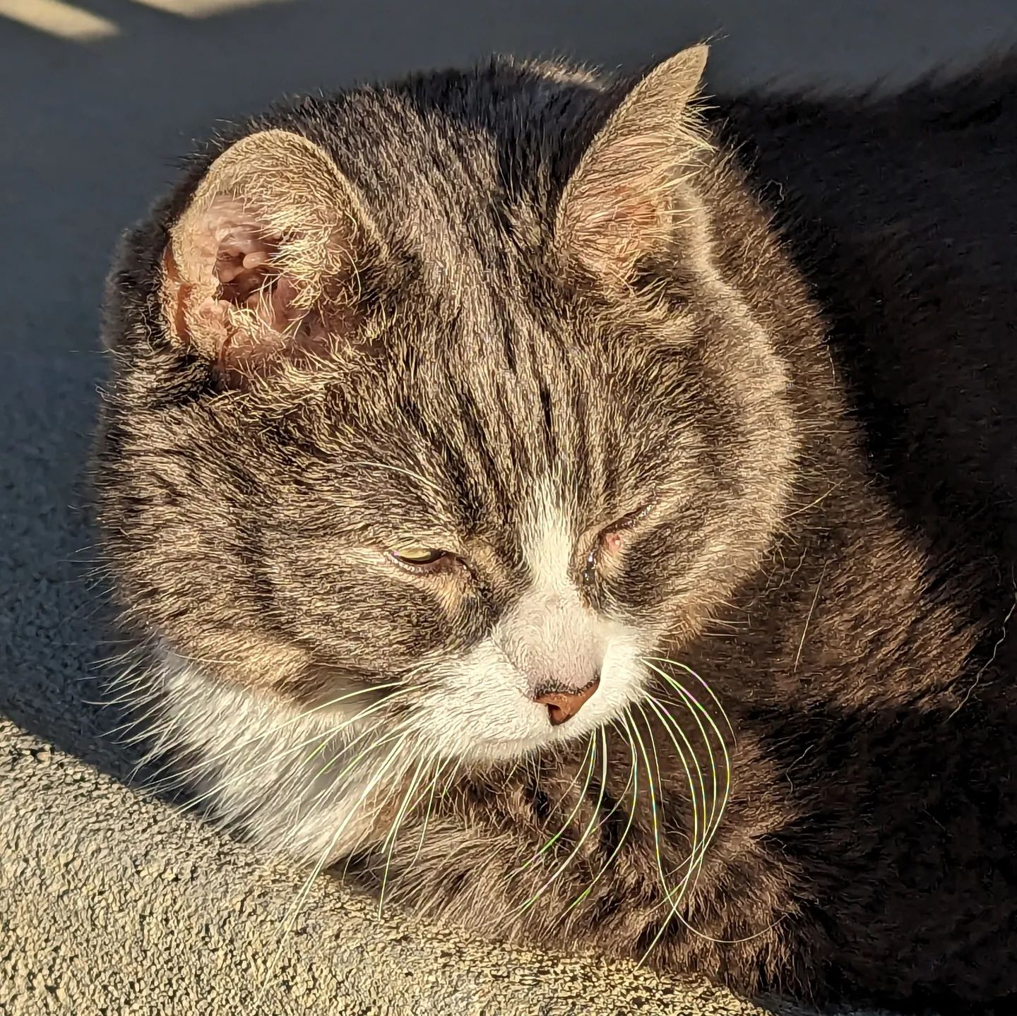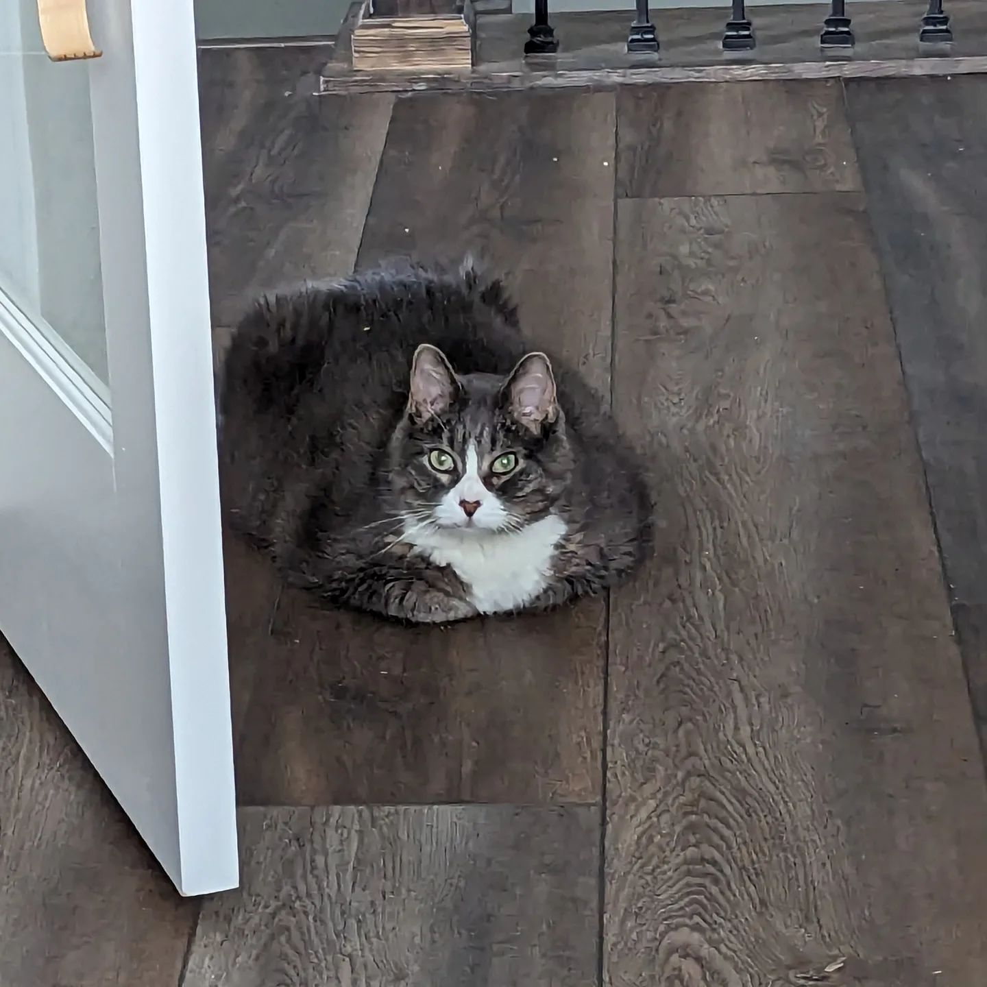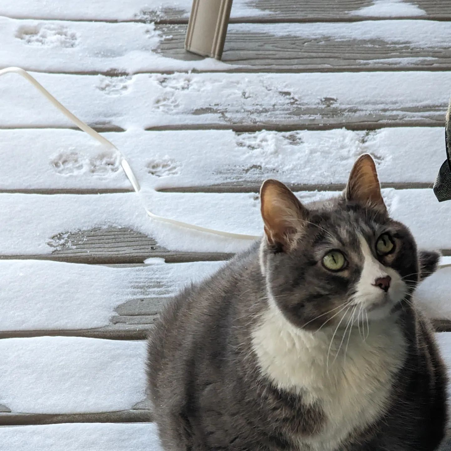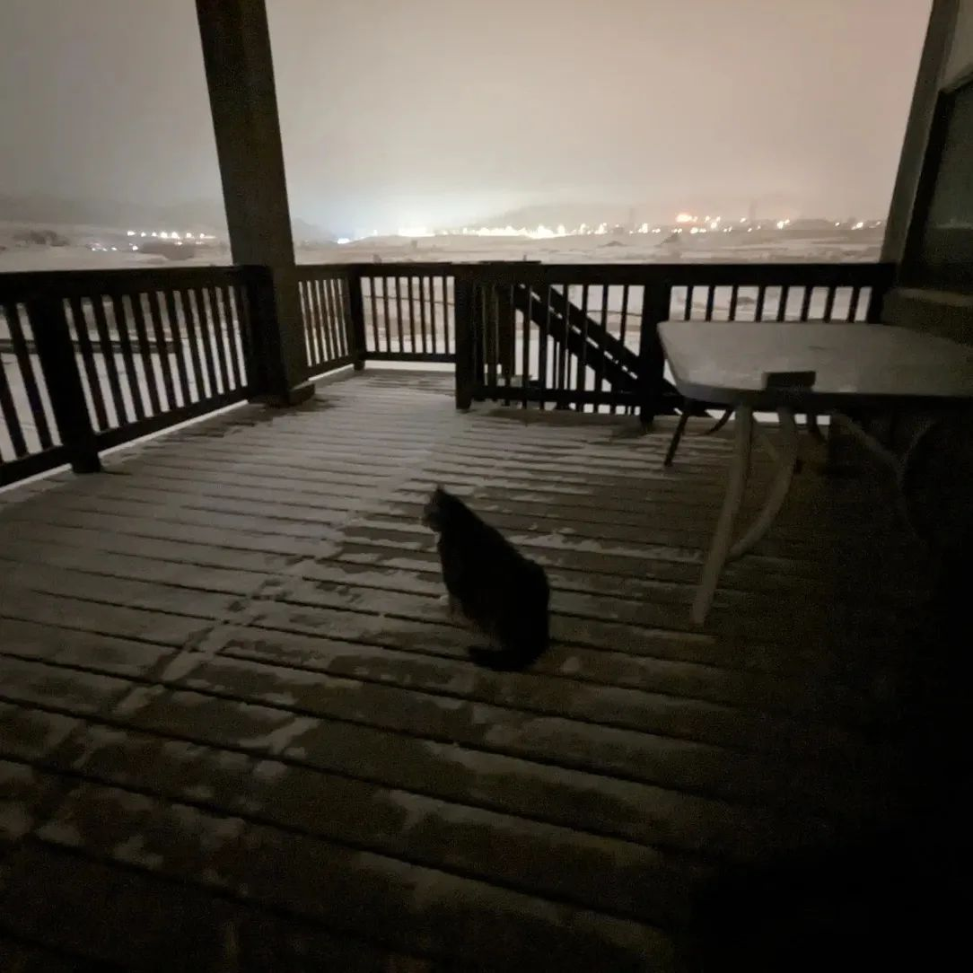 Happy Won't Look Whisker Wednesday from a proper cat loaf! Swipe for snowy sunrise over the neighborhood.