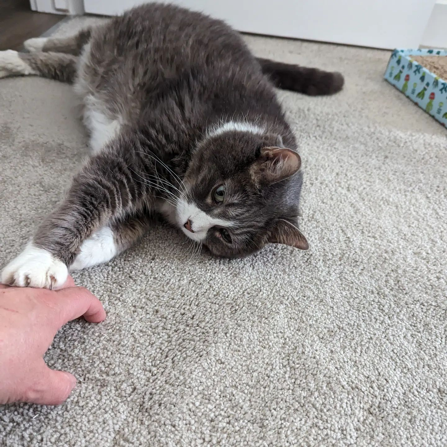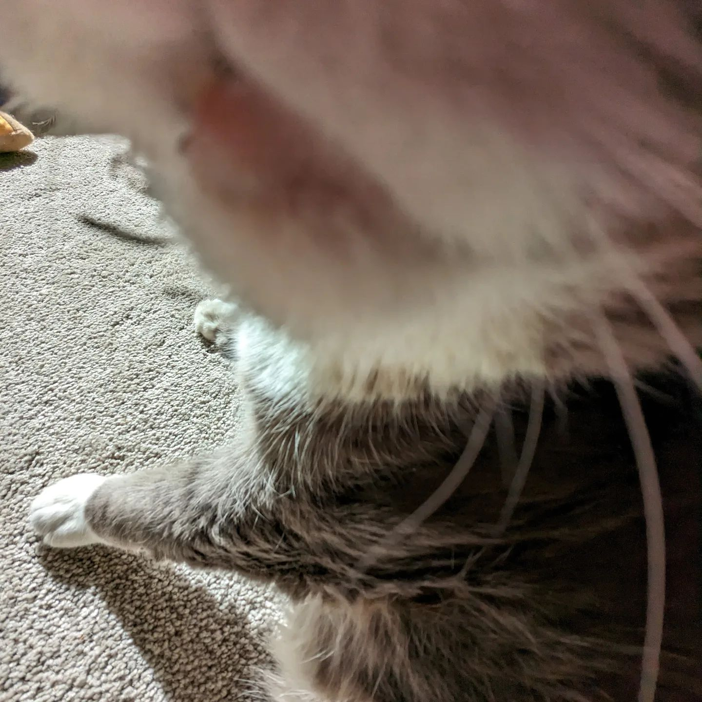 We went to the regular vet today. They did some chest x-rays and drew blood to test for pancreatitis. Results early next week. The X-rays revealed an arthritis hitch in her back. So, they did a laser pain therapy session on that and another water pack. She has definitely perked up and resumed normal eating and litter habits. The pain treatment is supposed to last 3 days.